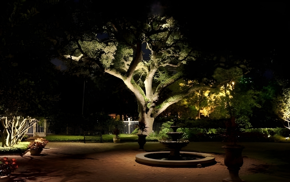 Imagine standing outside and feeling like the light is coming from the moon instead of some artificial spotlight. That’s basically what down-lighting does. Lights are mounted high, could be in a tree, roof edge, arbor, and the light filters through branches or gently falls over open areas. When done right, it doesn’t feel like lighting. It feels like your space is naturally lit from above.
